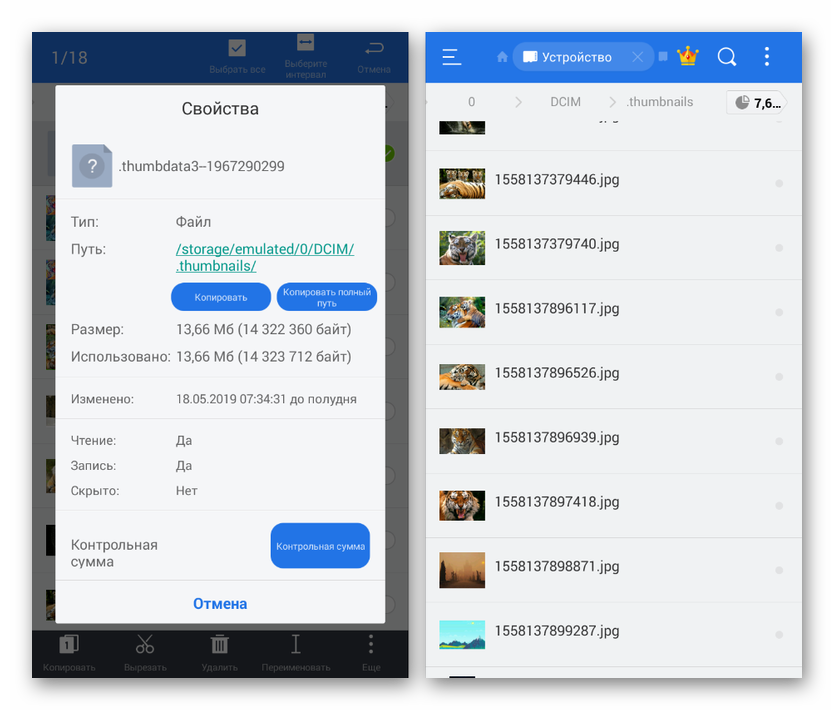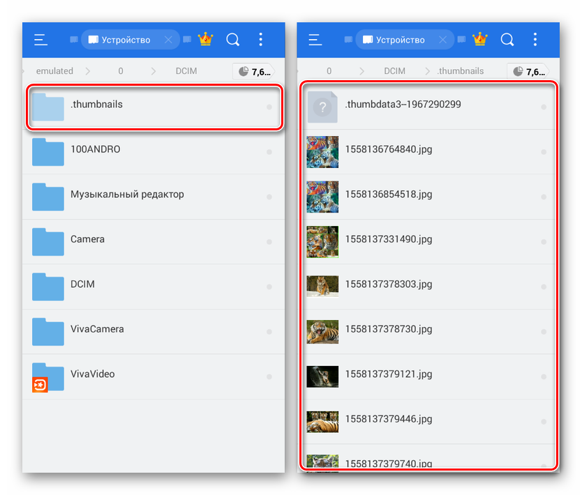 В отличие от большинства папок на телефоне, директория «.thumbnails» по умолчанию скрыта от глаз пользователя и не может быть открыта без файлового менеджера с поддержкой соответствующей функции. Получить доступ к папке можно посредством одного из файловых менеджеров, который, помимо отображения всех содержащихся внутри документов, включая скрытые, позволит произвести удаление.