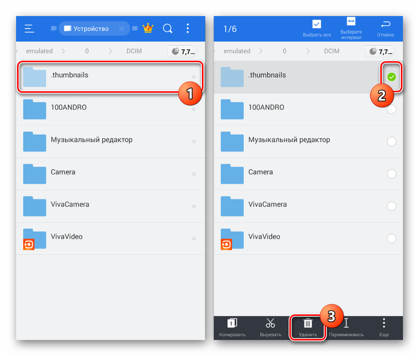 Внутри каталога нажмите по строке «.thumbnails» и удерживайте в таком состоянии несколько секунд до появления иконки с изображением галочки. После этого на нижней панели нажмите кнопку «Удалить», чтобы избавиться от папки и всех вложенных файлов.