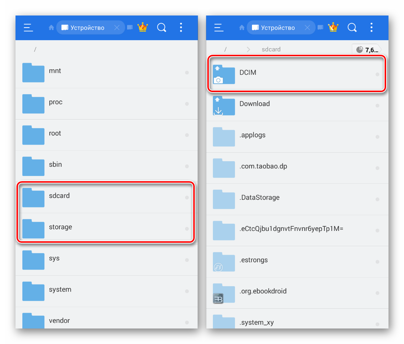 Откройте корневой каталог устройства, выберите папку «Storage» и перейдите в раздел «DCIM». По аналогии с этими можете найти ту же директорию на флешке «sdcard».