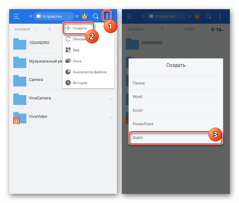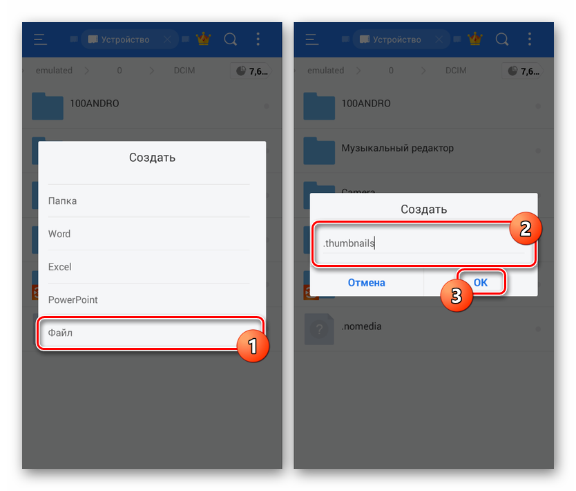 - После удаления папки «.thumbnails», находясь в каталоге «DCIM», нажмите по значку с тремя точками в правом верхнем углу экрана и выберите пункт «Создать». Из списка вариантов необходимо выбрать «Файл».