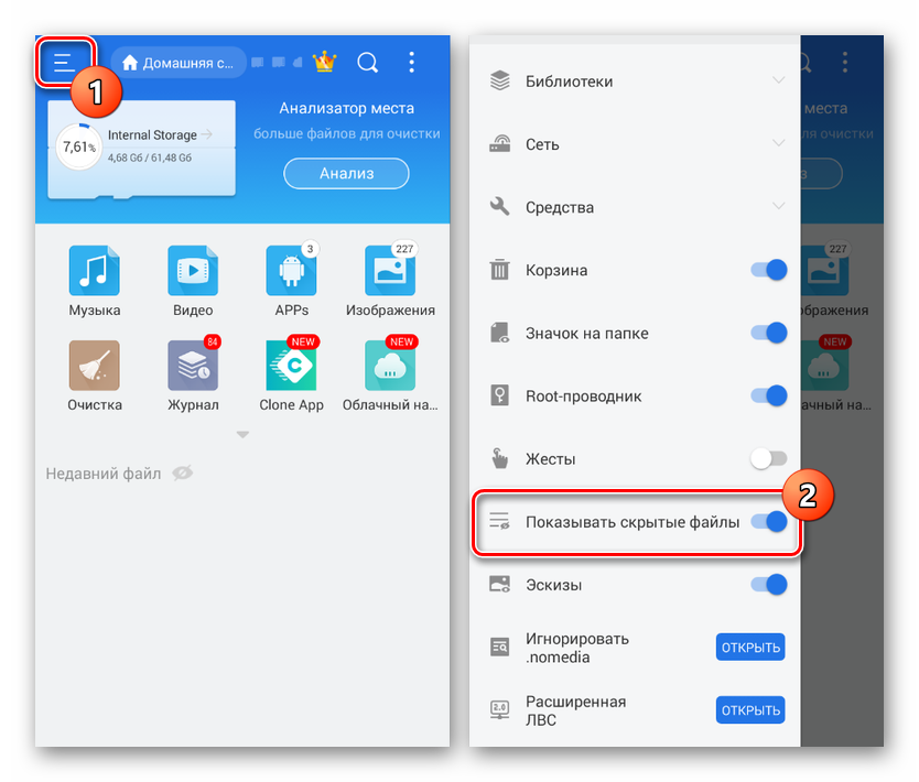- В приложении ES Проводник разверните главное меню в левом верхнем углу и найдите пункт «Показывать скрытые файлы». Измените положение ползунка, чтобы включить функцию.