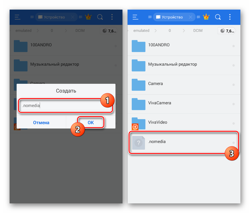 В появившемся текстовом поле впишите и нажмите «ОК». Если вы все сделали правильно, внутри каталога «DCIM» появится новый файл неизвестного формата и по умолчанию имеющий тип «Скрытый».