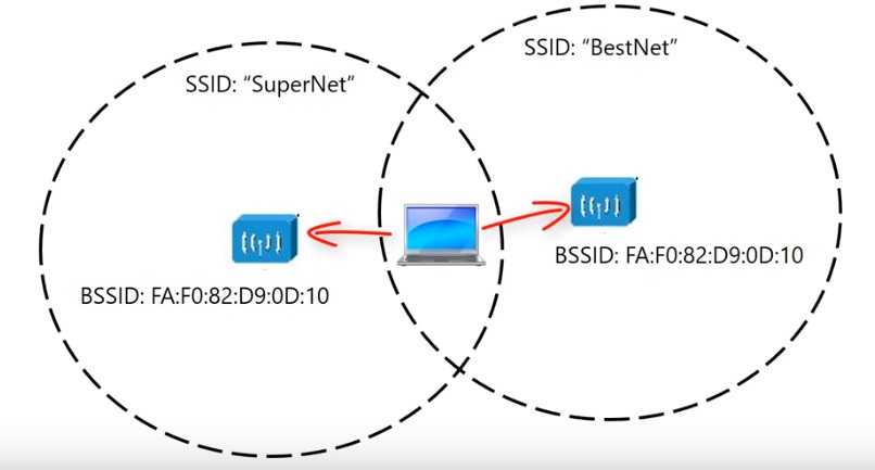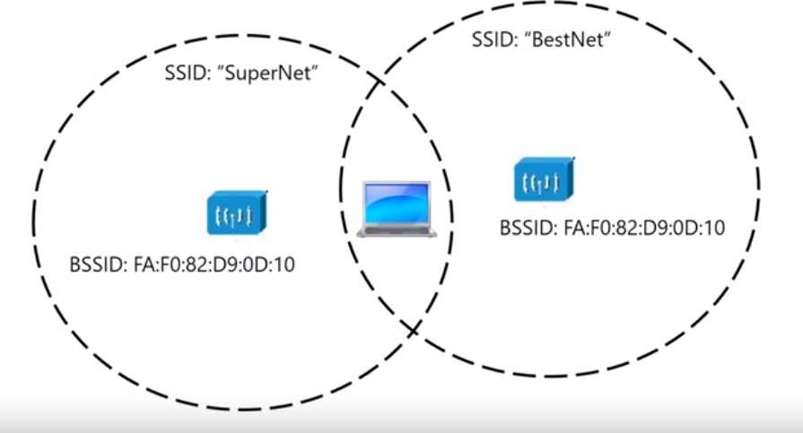 В радиусе действия, как на картинке выше, точка доступа отправляет идентификаторы из своего набора сервисов. ID базового набора сервисов BSSID: это МАК-адрес точки доступа. Также отправляются ID набора сервисов в виде, понятном для человека, текстовой строки SSID. Эти идентификаторы мы видим в списке доступных сетей, когда подключаемся к wi-fi.