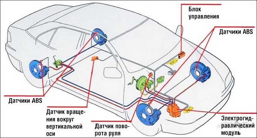 Фактически ESP состоит из микропроцессора (также называют электронным блоком управления), который постоянно обрабатывает сигналы, поступающие с датчиков скорости вращения колес, интегрированных в систему ABS, положения рулевого колеса и давления в тормозной системе.
