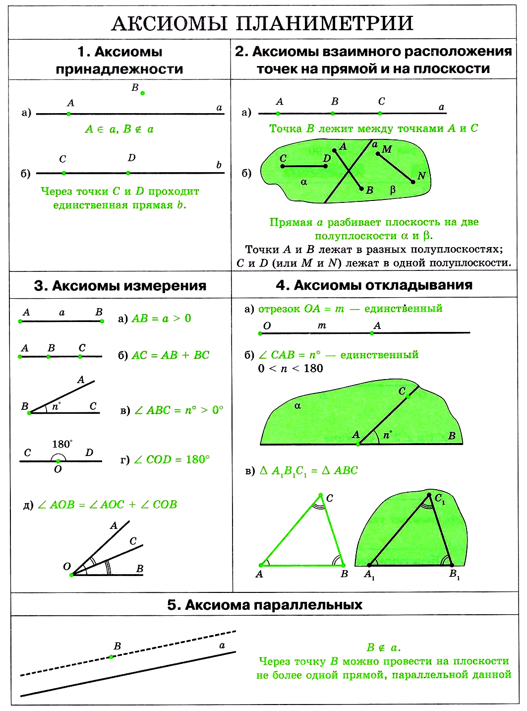 Аксиомы планиметрии – система аксиом, в которой собраны утверждения, не требующие доказательств, в отношениях с неопределяемыми (или основными) понятиями в планиметрии (точка, прямая, плоскость).