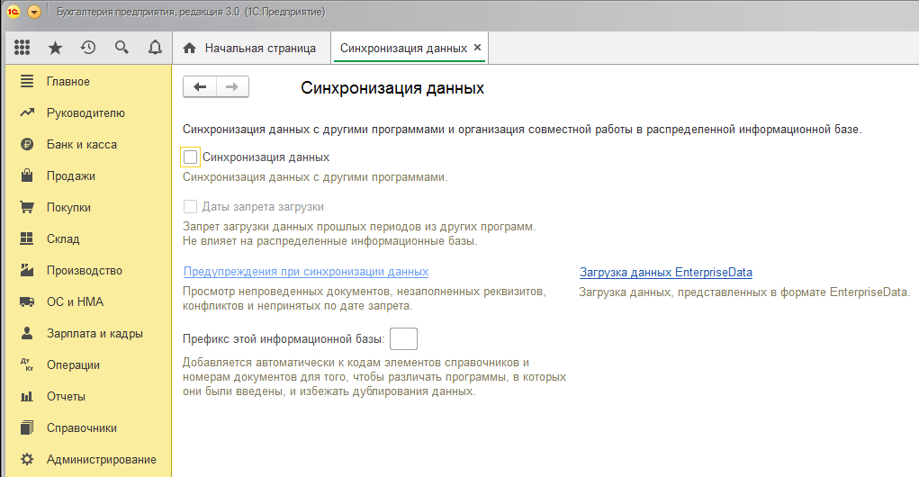 В случае если галочка Синхронизация не активна (как на рисунке ниже) – Ваша база не настроена на синхронизацию с другими базами 1С. К сожалению, рассмотрение настройки синхронизации выходит за рамки данной статьи, поэтому мы ограничимся лишь упоминанием этой возможности.
