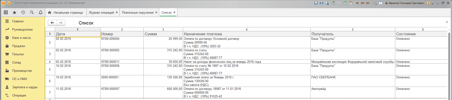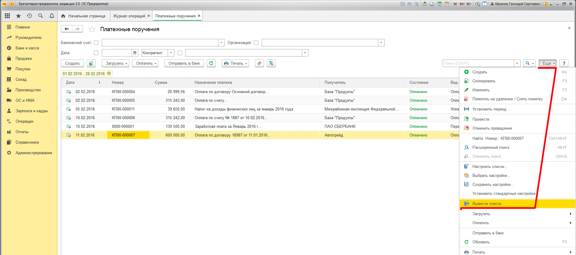 В качестве примера рассмотрим список платёжных поручений. Для его выгрузки обратимся к меню Ещё – Вывести список: