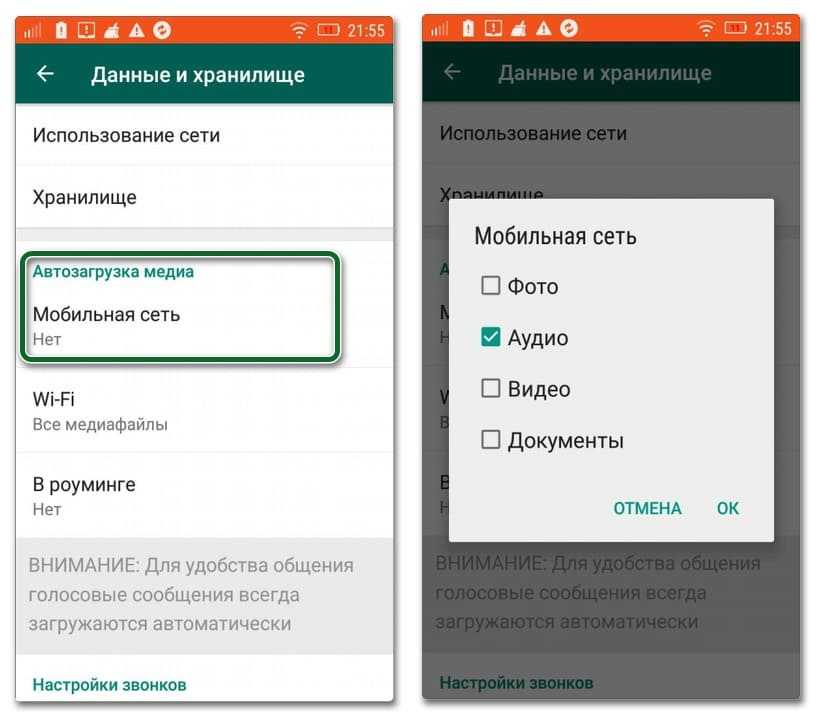 - В строке «Автозагрузка медиа» поочередно коснуться надписей «Мобильная сеть», «Wi-Fi» и «В роуминге» и поставить в них галочки напротив «Аудио».