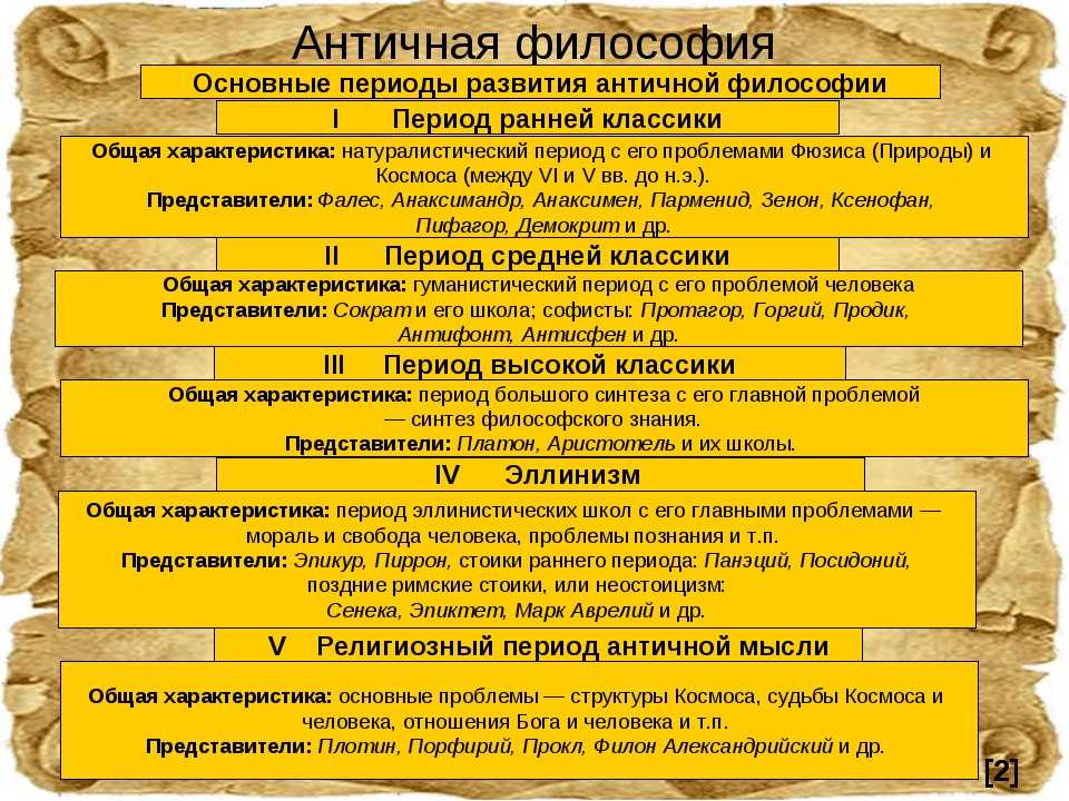 Античная философия — это последовательно развивавшаяся философская мысль, которая охватывает период свыше тысячи лет — с конца VII в. до н.э. вплоть до VI в. н.э.