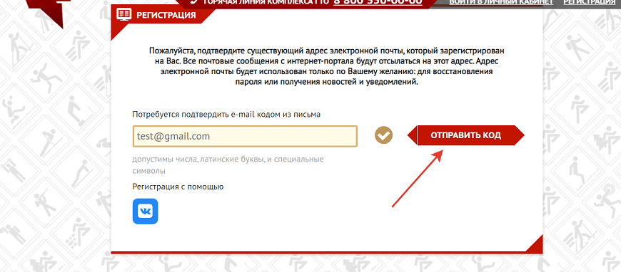 Вводим адрес своего электронного почтового ящика, и нажимаем «Отправить код». Проверяем почтовый ящик. В письме придет уникальный цифровой код. Вводим его на сайте. Или авторизуемся через социальную сеть «ВК».