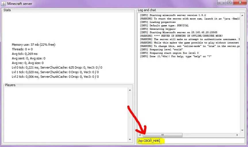 Для начала я на всякий случай напомню для тех, кто только что создал свой сервер в Minecraft: что бы стать админом на своем сервере вам нужно будет от имени сервера написать: