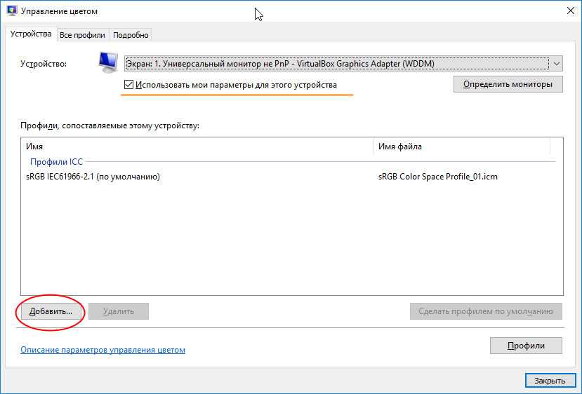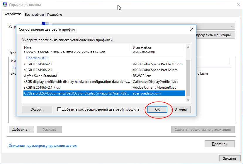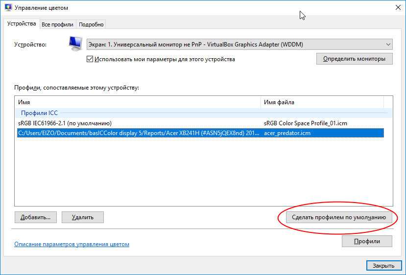 Если его в списке не окажется (это может быть при простом копировании ICM-файл в системный каталог) укажите путь к ICM-файлу вручную через обзор. После того как профиль будет добавлен в окно «Управление цветом», назначьте его профилем по умолчанию, нажав одноименною кнопку.