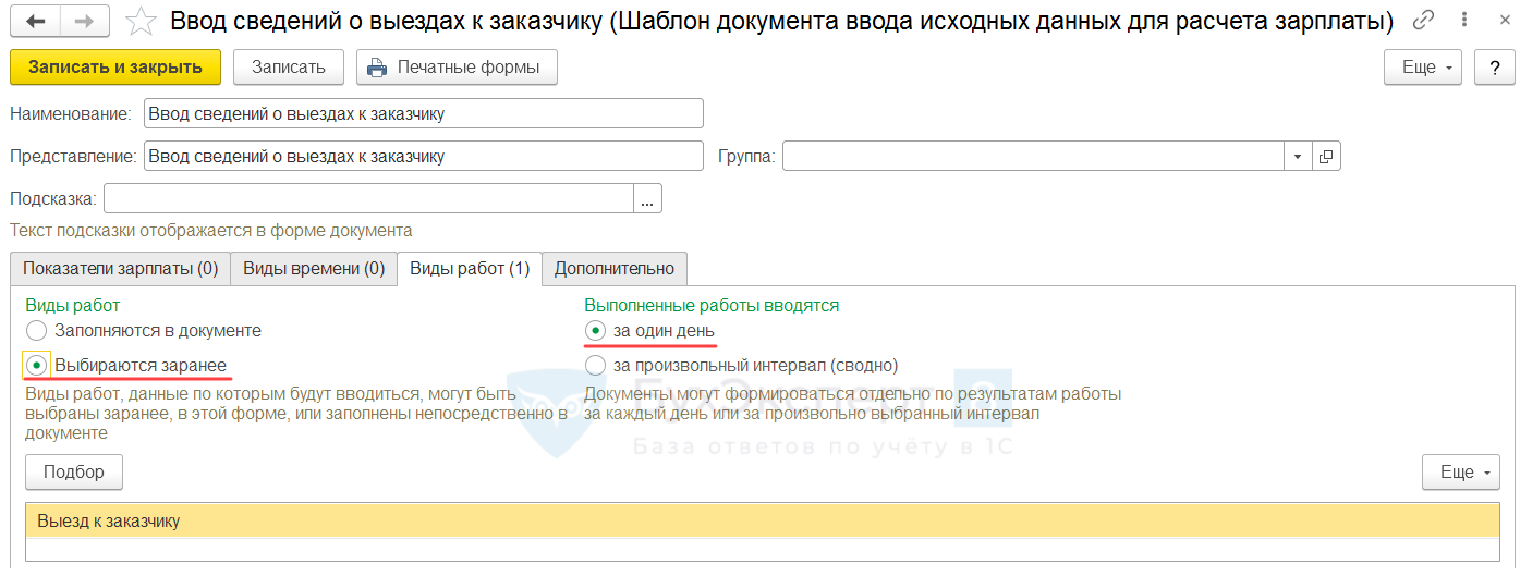 - данные о количестве выездов к клиентам регистрируются в программе ежедневно, поэтому установим переключатель Выполненные работы вводятся в положение За один день.