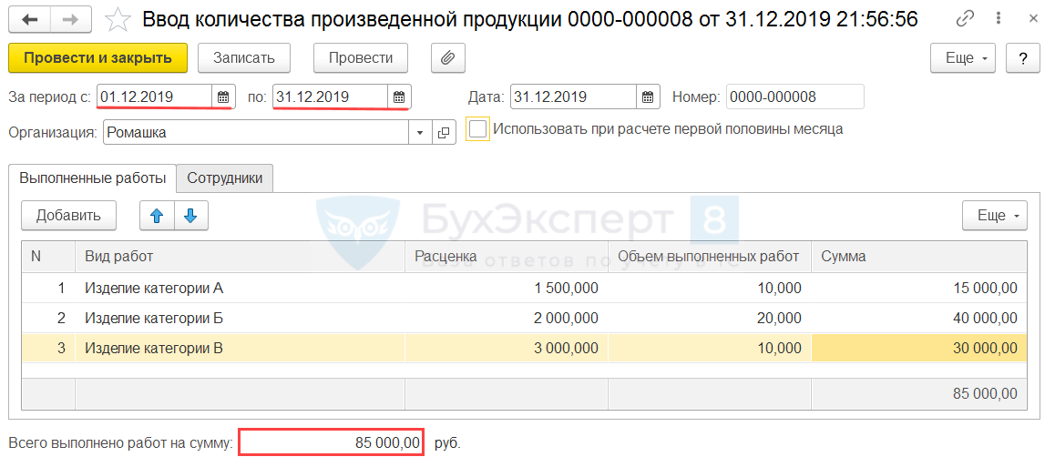 Создадим документ Данные для расчета зарплаты для ввода сведений об объеме производства продукции. В документ укажем, что данные о сдельном заработке вводятся За период с 01.12.2019 по 31.12.2019. На вкладке Выполненные работы заполним Виды работ и Объем выполненных работ. Показатели табличной части Расценка и Сумма, а также итоговый показатель Всего выполнено работ на сумму будут заполнены автоматически.