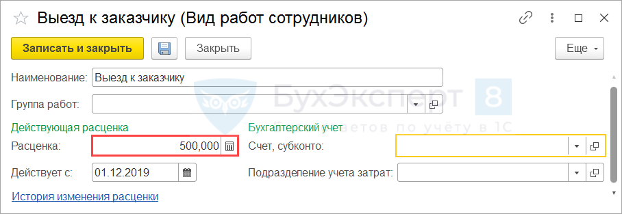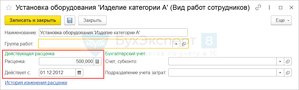 Расчет показателя Сдельный заработок производится по видам работ, которые хранятся в одноименном справочнике Виды работ (Настройка – Виды работ). В форме элемента справочника необходимо указать Расценку за работу, а также указать для расценки дату Действует с.