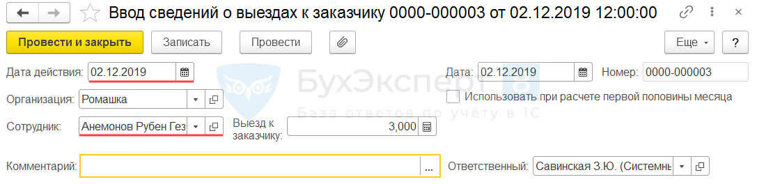 Для ввода данных о количестве выездов Анемонова Р.Г. к заказчику за 02.12.2019 создадим документ Данные для расчета зарплаты. Заполним Дату действия, укажем Сотрудника и количество выездов.