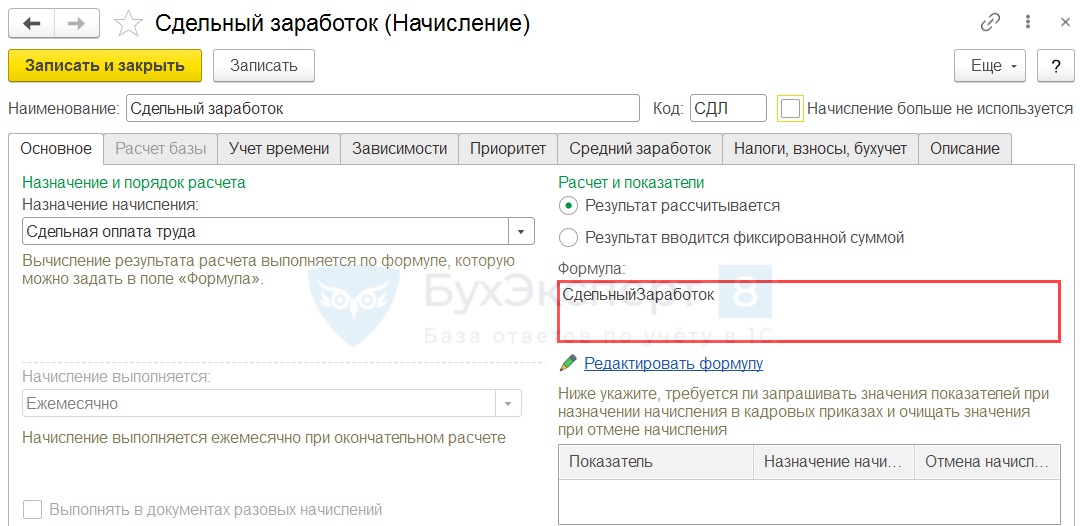 Если в организации не предусмотрено сравнение сдельного заработка с повременной оплатой, рассчитанной исходя из оклада или часовой ставки, можно изменить Формулу типового начисления или создать отдельное Начисление (Настройки – Начисления).