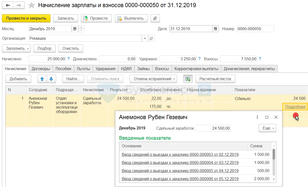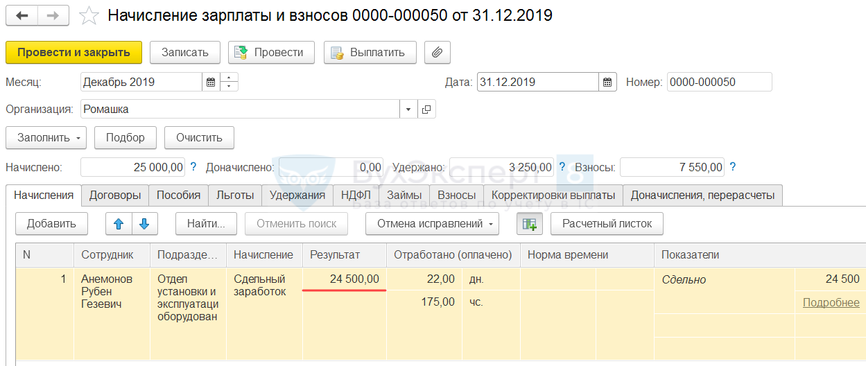 Создадим аналогичные документы за каждый день работы Анемонова Р.Г. Для расчета заработной сотрудника за декабрь 2019 создадим документ Начисление зарплаты и взносов. В результате автоматического расчета сотруднику было начислено 24 500 руб.