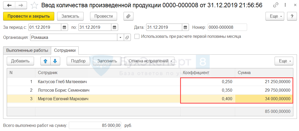 - соблюдая условие задачи, установим настройку, что объем выпуска Распределяется по списку сотрудников по способу Пропорционально коэффициентам.