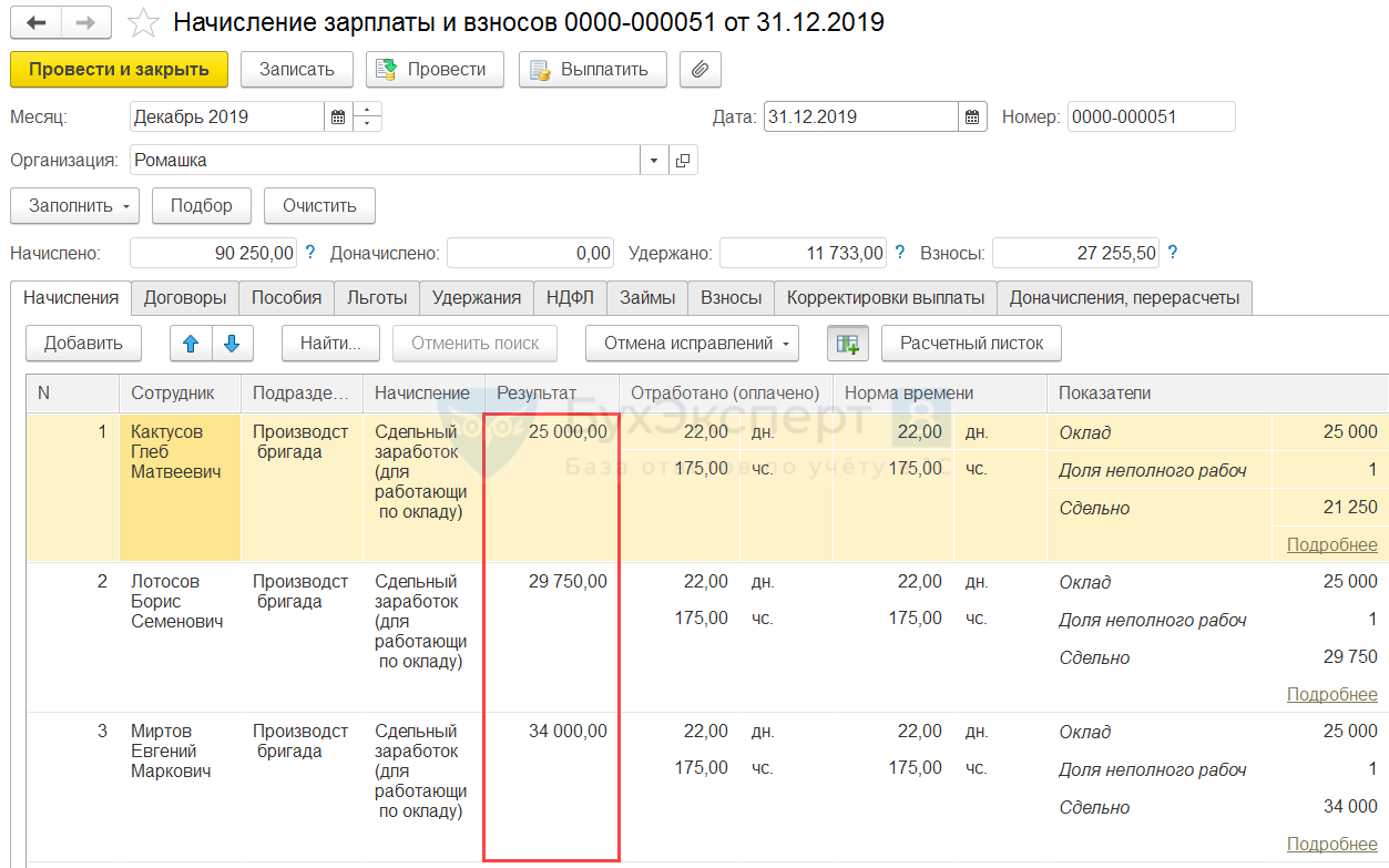 Создадим документ Начисление зарплаты и взносов для расчета заработной платы сотрудников за декабрь 2019. В результате автоматического расчета суммы начислений по Лотосову Б.С. (29 750 руб.) и Миртову Е.М. (34 000 руб.) совпадают с размером их сдельного заработка. Сумма сдельного заработка Кактусова Г.М. (21 250 руб.) оказалась меньше установленного сотруднику оклада (25 000 руб.). В результате Кактусову Г.М. была начислена большая из сравниваемых величин (25 000 руб.).