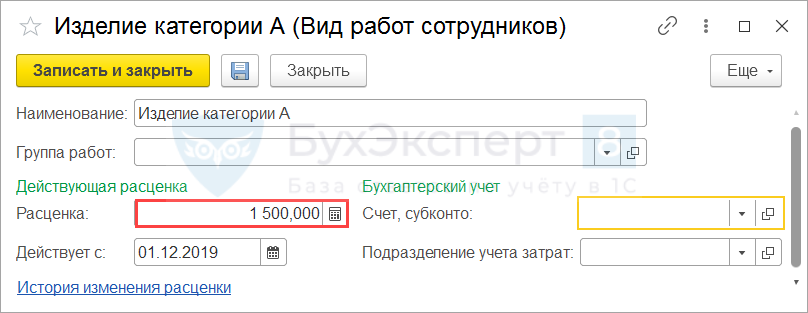 Создадим новый Вид работ для изделия категории А и укажем его Расценку.