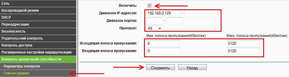 На примере мы присвоили своим ноутбуку, смартфону и планшету IP 192.168.0.100 – 102, поставили им различные лимиты в обоих направлениях и активировали правила.