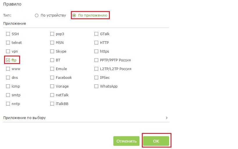 Для его создания кликаем по пункту «Выберите» и из выпадающего списка выбираем интересующий нас тип передачи данных или предустановленные настройки для конкретного приложения. Например, можно задать в пропускной способности сети приоритет для почтовых приложений типа Outlook или TheBat (пункт SMTP, POP3…) или для ftp-клиентов (FTP, SFTP, WLM…). Также есть большой список популярных игр, например Counter Strike, и программ для обмена файлами — BitTorrent, eDonkey и т.д.