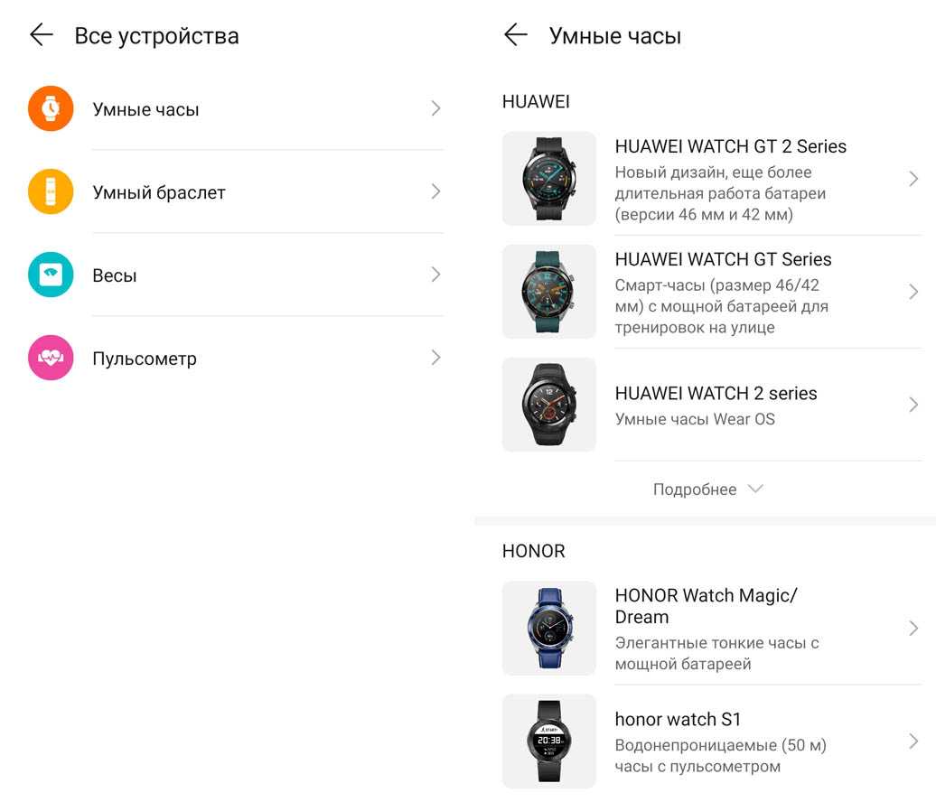 Для подключения умных часов к телефону вам понадобится мобильное приложение Huawei Health («Здоровье»). Найдите его в поисковой строке магазинов «Play Маркет» (для Android), App Store (для iOS) или AppGallery (для пользователей Huawei). Примите всю необходимую документацию и дайте запрашиваемые разрешения. Кликните по трем точкам вверху и выберите «Добавить». В открывшемся разделе выберите «Умные часы» (Smart Watch) и в построенном списке найдите свою модель. Дождитесь обновления списка или при необходимости сделайте свайп вверх-вниз. Нажмите кнопку «Сопрячь» (Pair), разрешите приложению подключить Bluetooth, если он был выключен, и кликните по галочке на часах.