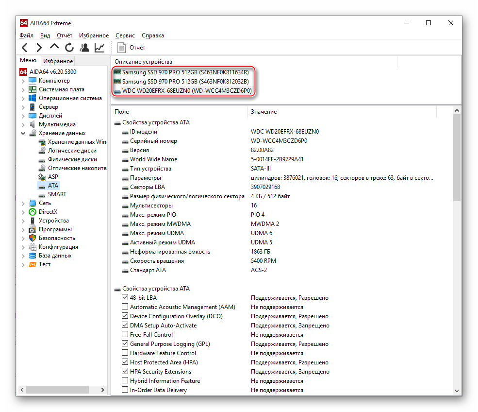 Когда речь заходит о необходимости выяснить что-либо о компьютерных комплектующих, многие сразу же обращаются к АИДА64. Это приложение уже зарекомендовало себя во множестве других вопросов, связанных с диагностикой элементов компьютера. В ней позволяется узнать и то, какие накопители установлены в ПК.
