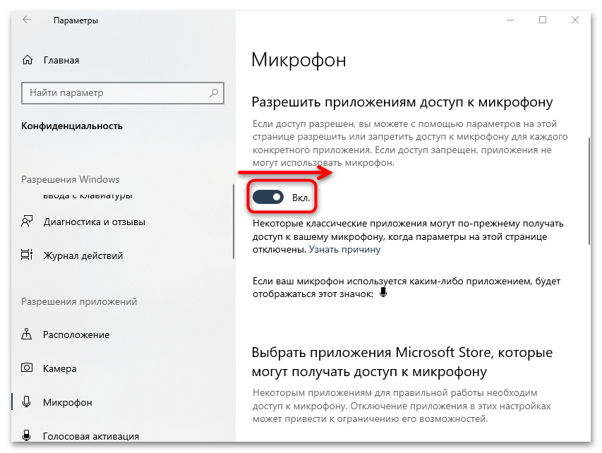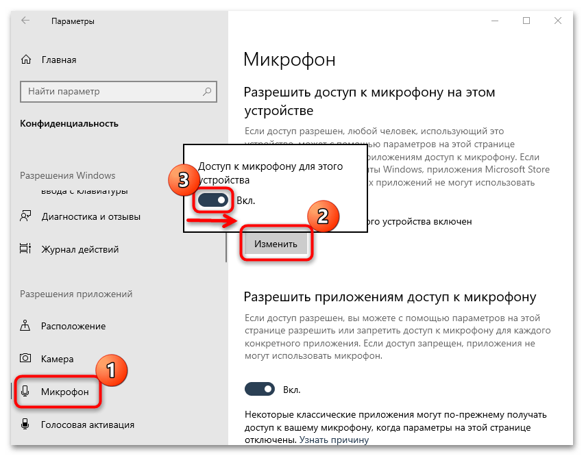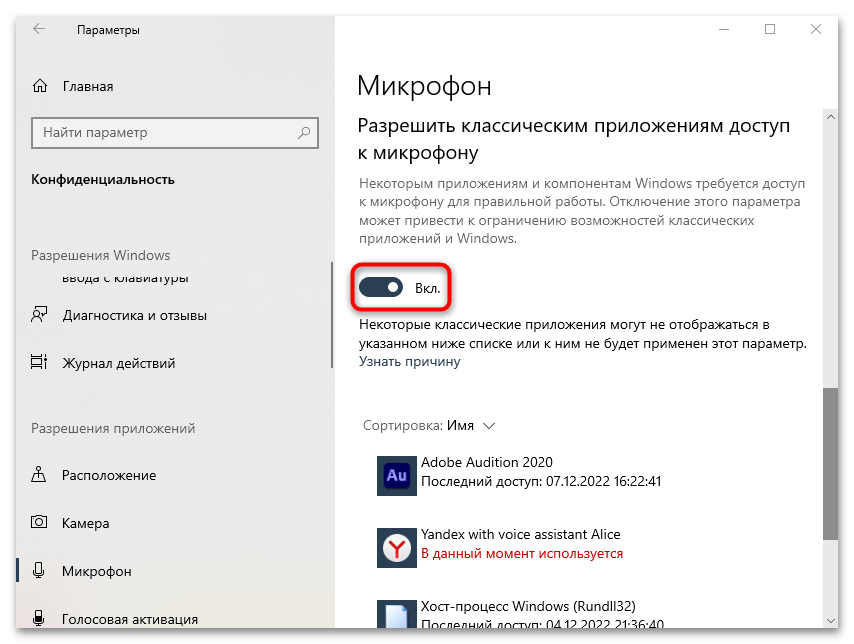 4. Вы увидите список приложений, которые имеют доступ к микрофону. Чтобы отключить доступ к микрофону для какого-то приложения, просто переключите выключатель на позицию «Выкл» (Off).