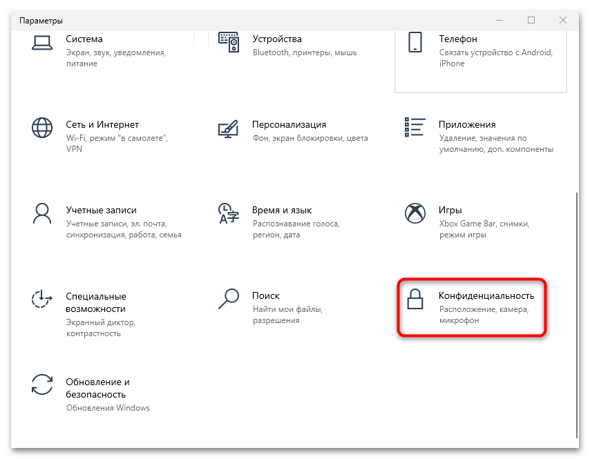 2. Прокрутите вниз и найдите вкладку «Конфиденциальность» (Privacy).