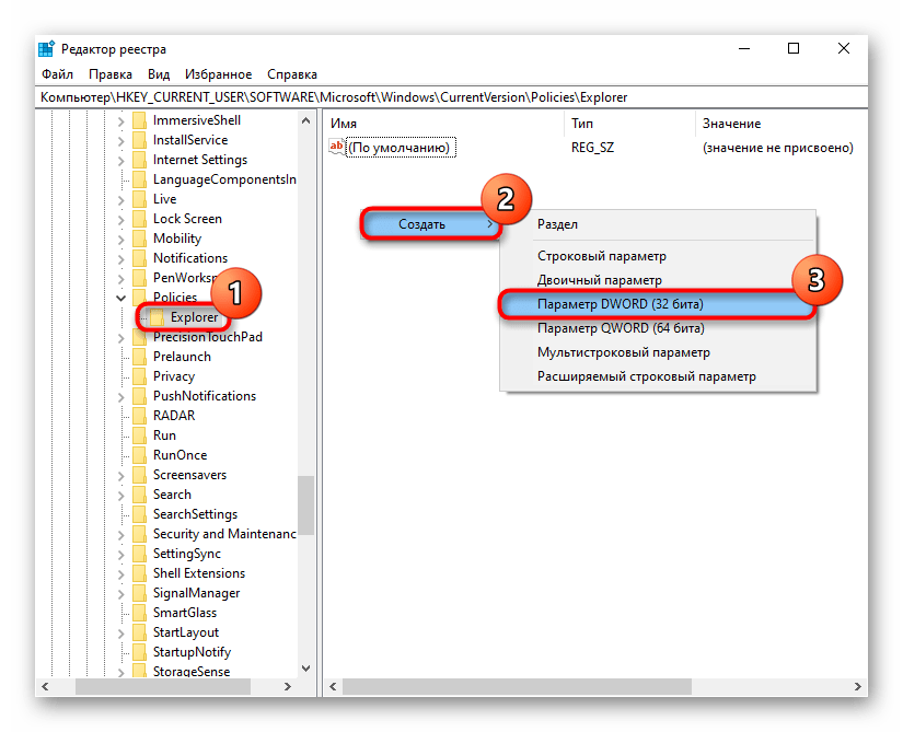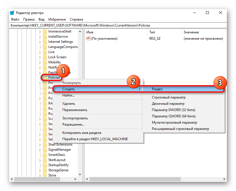 У некоторых пользователей будет отсутствовать подпапка «Explorer», поэтому ее придется создать самостоятельно. Для этого щелкните правой кнопкой мыши по «Policies» в левом столбце и выберите пункт «Создать раздел», а затем переименуйте его в «Explorer».