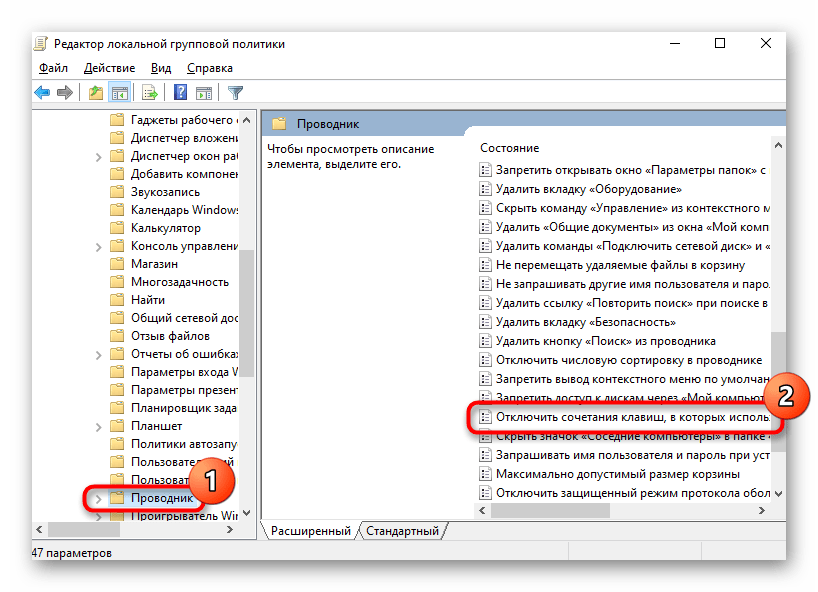 Выберите подпапку «Проводник» и в правой части найдите пункт под названием «Отключить сочетания клавиш, в которых используется клавиша Windows». Откройте его двойным нажатием левой кнопки мыши.