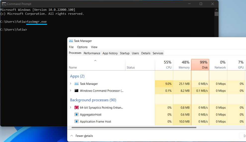 Пожалуй, самый сложный, но работающий, вариант включения в Windows 11 диспетчер задач – это использование интерпретатора командной строки или, что идентично – PowerShell. В обоих случаях нужно в консоли набрать команду taskmgr.exe и для запуска утилиты нажать Enter.
