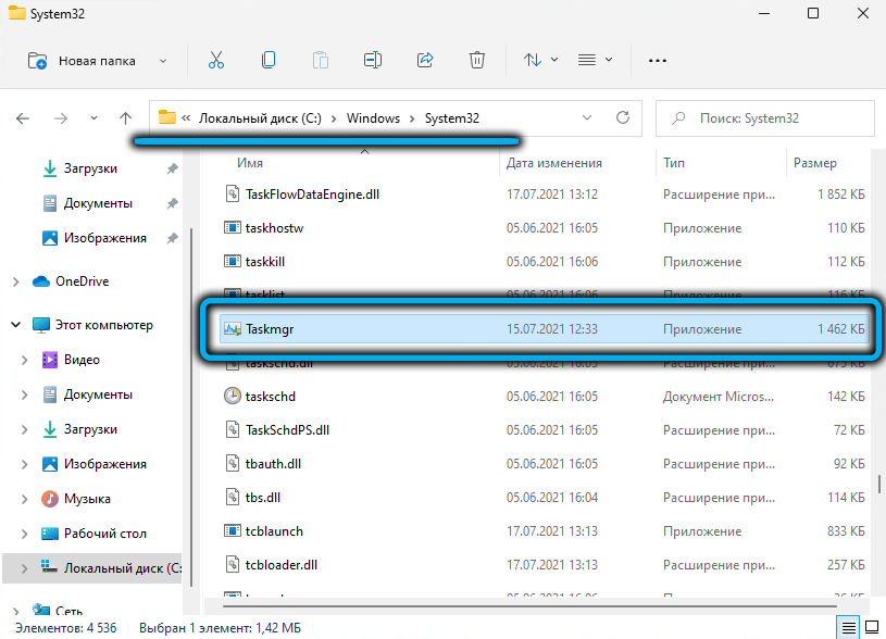 Существует категория пользователей, активно использующих файловые менеджеры типа Total Commander (да даже штатный файловый менеджер). Запомнить, где находится исполняемый файл диспетчера задач, несложно – это самая большая и известная папка Windows system32. Достаточно попасть в эту директория и найти в ней taskmgr.exe, запустив его.
