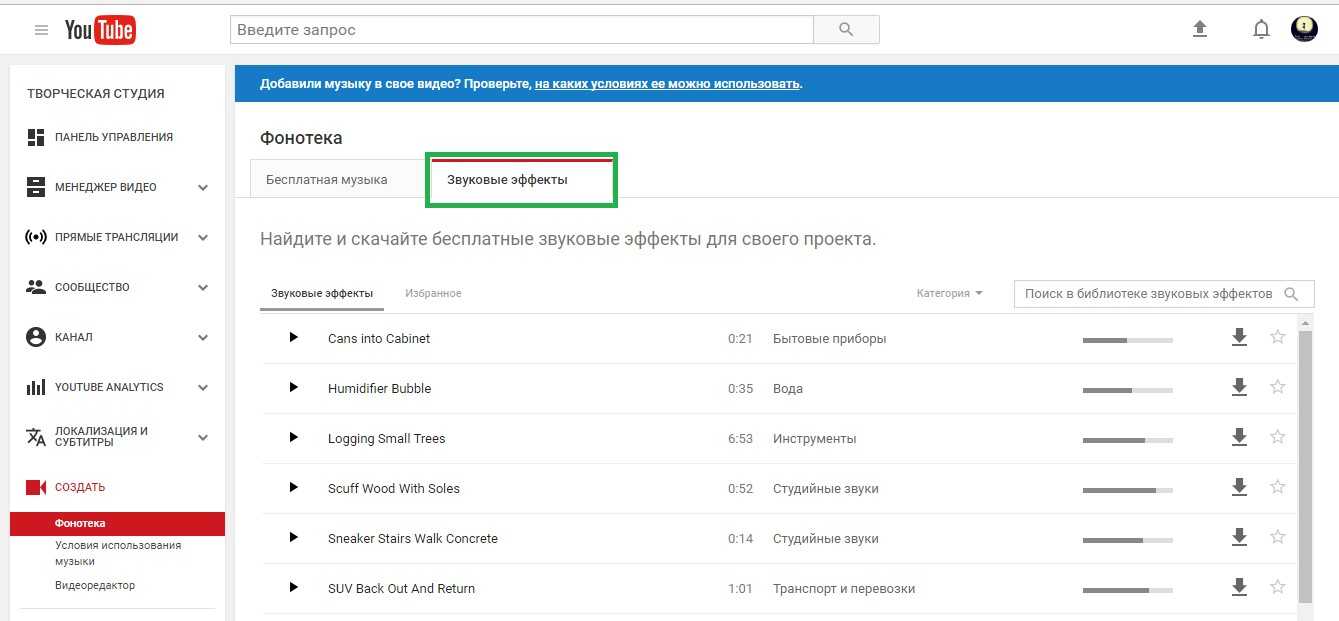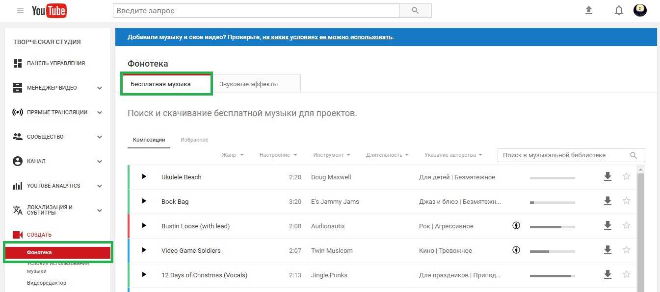 Чтобы перейти в фонотеку, откройте свой аккаунт YouTube, перейдите в творческую студию и выберите раздел Фонотека.