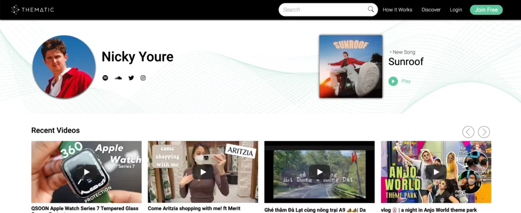 For example, creators get curated Weekly Matches every Friday on Thematic. Each creator gets their own personalized mix of songs and curated playlists matched to the creator’s aesthetic.