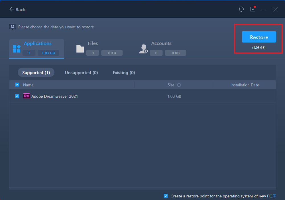 Over on Applications, Files, or Accounts to choose the specific data you want transfer flexibly. Click «Restore» to confirm. Besides, you can also click the «Migration Settings» icon to change the target path to recover and save the files.