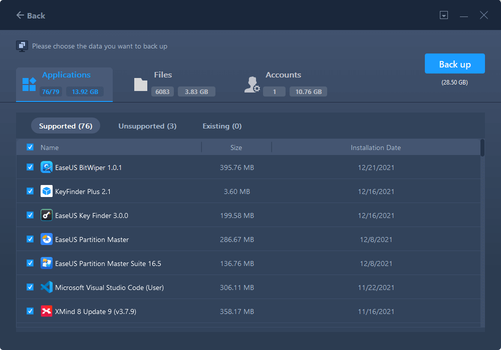 3. Hover over «Applications», «Files» and «Accounts» columns to choose the specific data, applications, etc., and click «Back up» to create a backup file.
