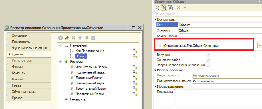 Рис. 4. Регистр сведений «Склонения представлений объектов» — тип измерения «Объект»