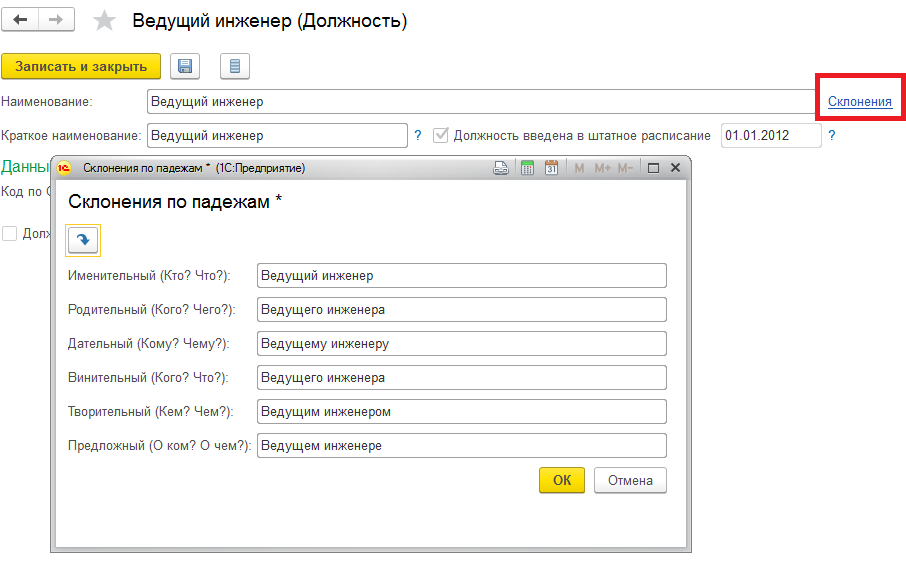 Именно эти объекты конфигурации могут склоняться. В карточке каждого из них есть гиперссылка «Склонения», по нажатию на которую открывается форма со всеми падежами.