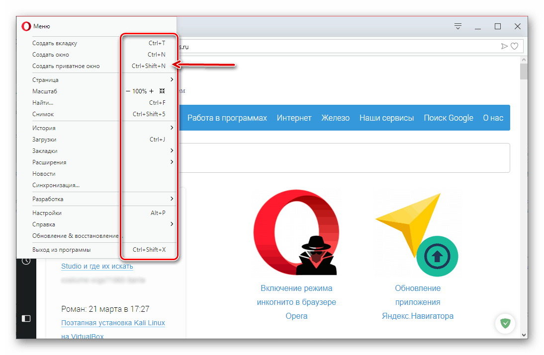 - Ctrl + N — открыть новое окно в текущей вкладке.
