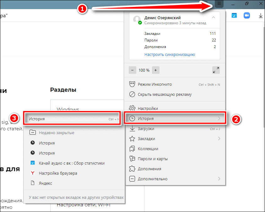 Мне кажется, что путь в журнал в этом браузере самый неочевидный. Чтобы попасть на страницу истории, вам понадобится зайти в два разных меню. Выглядит это следующим образом: