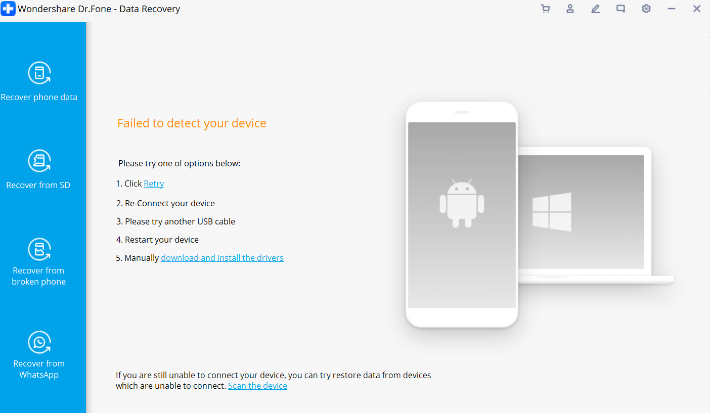 В моем случае Dr.Fone не сумел отобразить информацию на смартфоне, хотя само устройство обнаружил. Скорее всего, это произошло из-за отсутствия прав рут. По отзывам пользователей, приложение неплохо справляется с задачей поиска и восстановления потерянных данных. Но полного восстановления добиться не удастся.