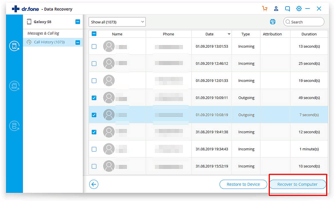 - Программа начнет процесс восстановления данных. Для его удачного завершения потребуется root-доступ. Найденные записи журнала звонков отобразятся в окне Call history. Отметьте те строки, которые хотите сохранить и перенесите журнал в папку на компьютере, нажав на «Recover to Computer».