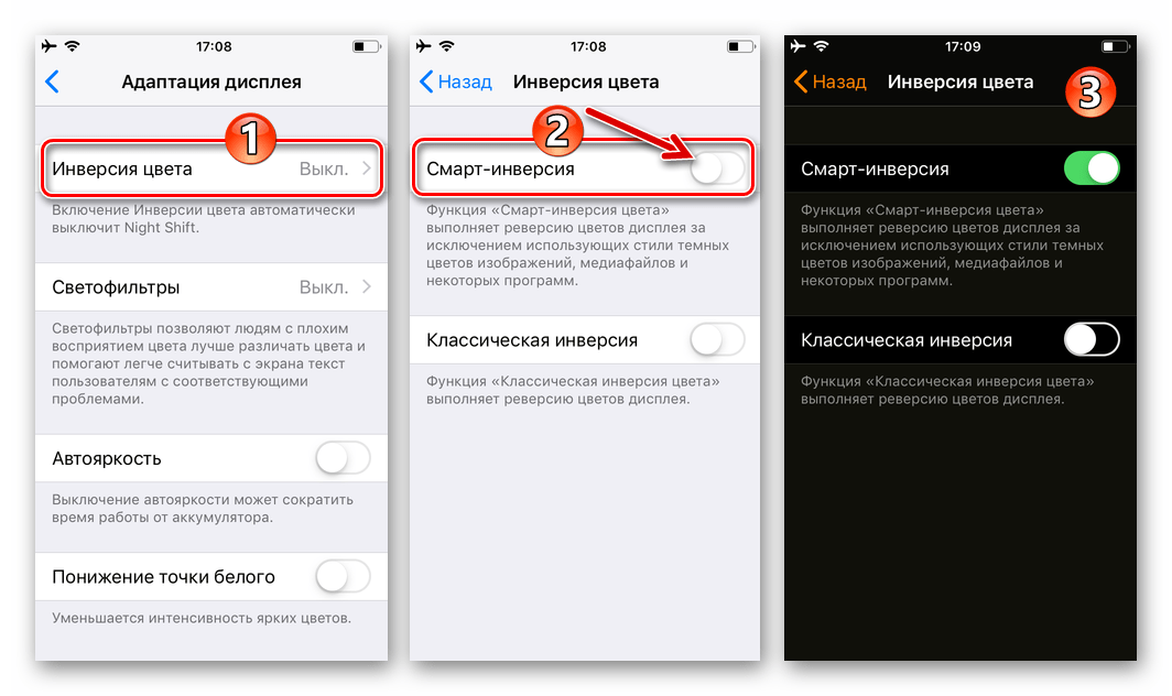 Теперь нажмите «Инверсия цвета», что приведёт к открытию экрана, где можно активировать целевую опцию. Коснитесь переключателя справа от наименования «Смарт-инверсия», переведя его таким образом в положение «Включено». После выполнения указанной манипуляции интерфейс айОС мгновенно преобразуется в нужном нам направлении.