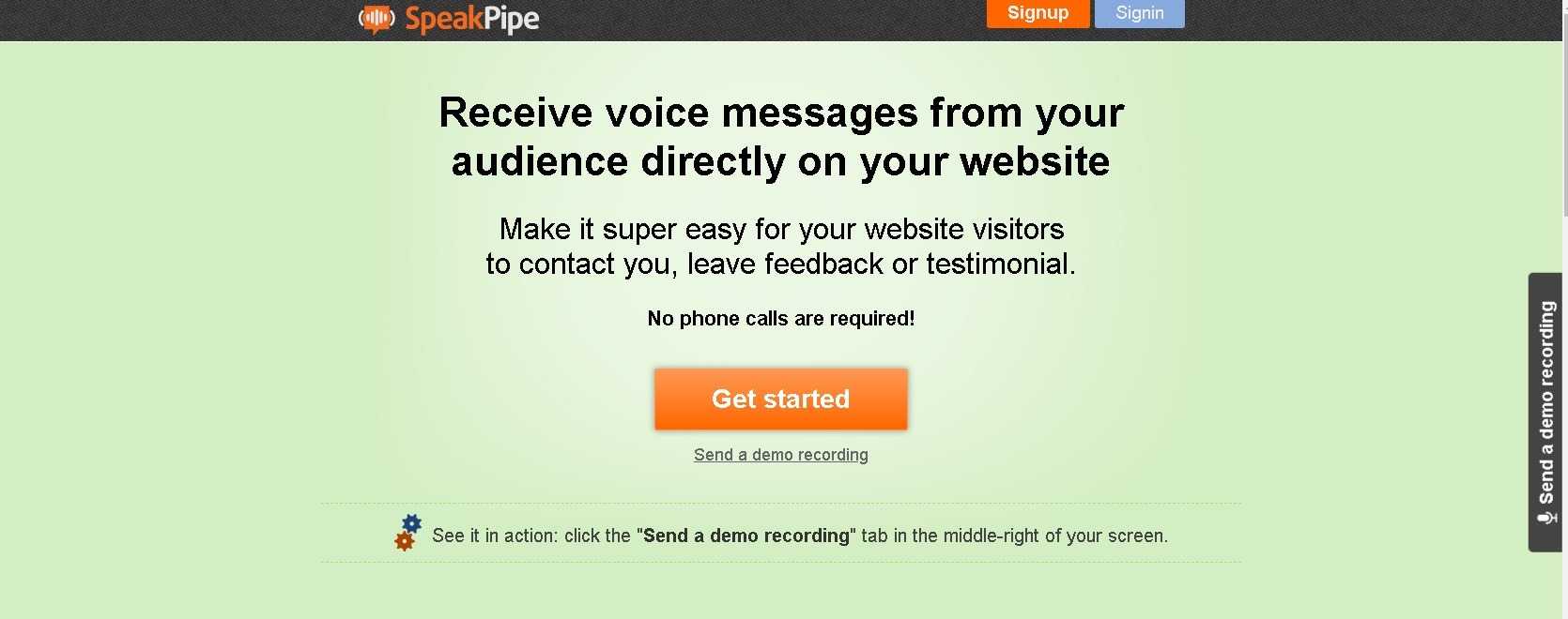 Еще один полезный онлайн-ресурс для проверки микрофона это Speakpipe.com. Хотя он не имеет русскоязычного интерфейса, работать с ним достаточно просто. Чтобы начать тестирование нужно нажать кнопку «Get started » и разрешить приложению использовать микрофон. Для окончания тестирования нажмите «Stop ». В результате работы создается аудиофайл, который можно прослушать или послать по электронной почте. Для отправки файла нужно нажать на кнопку «Send a demo recording ».