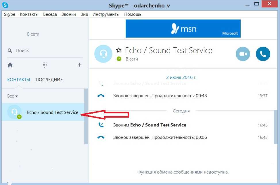 - в списке контактов следует найти Echo (также данный контакт может называться SkypeTestCall, SoundTestService);