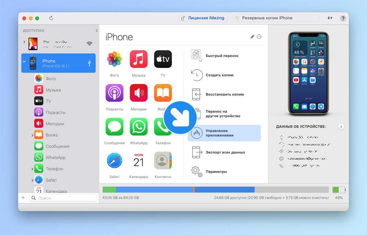 Запустите приложение iMazing и подключите iPhone к компьютеру при помощи кабеля.